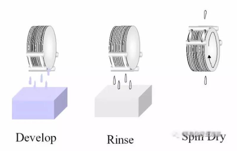 。一般采用多次旋覆显影液:次涂覆、保持10~30秒、去除;第二次涂覆、保持、去除。然后用去离子水冲洗(去除硅片两面的 所有化学品)并旋转甩干。优点:显影液用量少;硅片显影均匀;最小化了温度梯度。