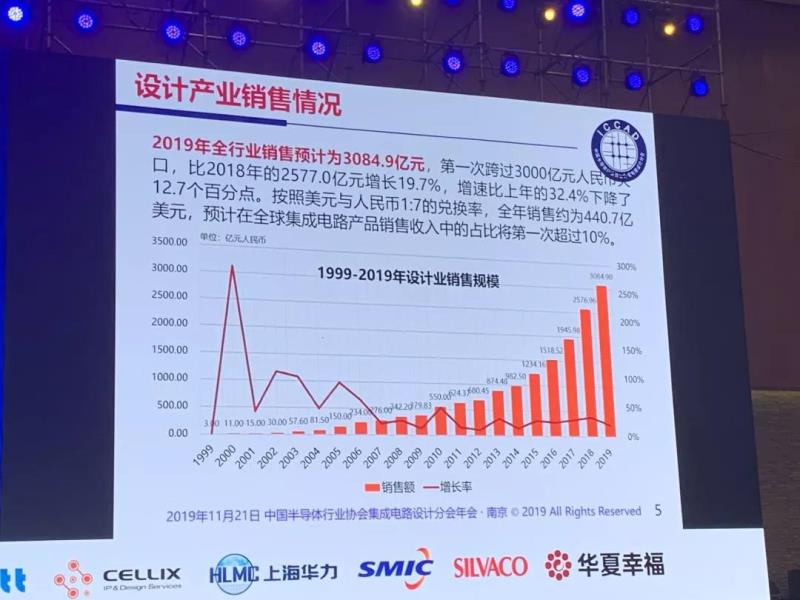 2019年,IC设计销售收入预计超过3084.9亿元,比 2018年的2576.9亿元增长约19.7%,占全球集成电路设计业的比重首次超过10%。