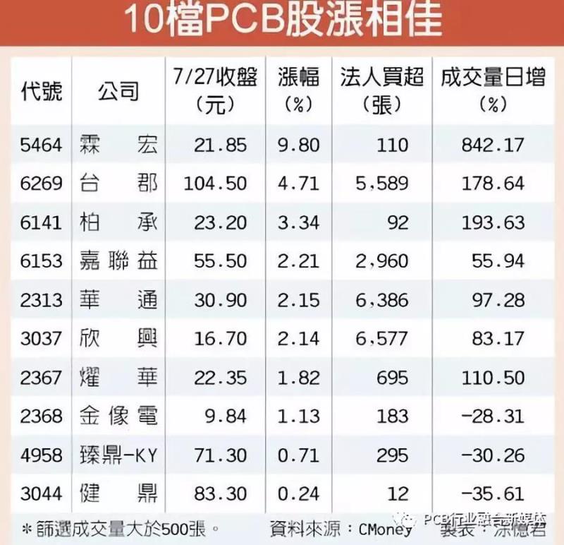 台股多方氛围转佳,印刷电路板(PCB)族群昨(27)日受惠苹果财报公布在即,又是消费性电子上游抢先拉货标的,由霖宏(5464)登高一呼冲涨停,台郡(6269)、柏承(6141)涨逾3%,买盘增温。