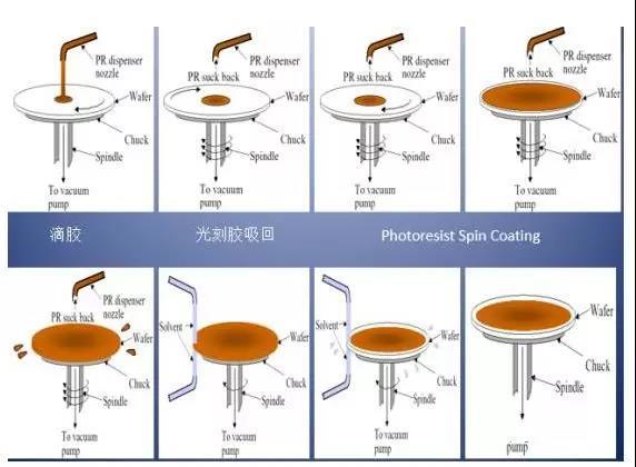 光刻胶涂覆通常的步骤是在涂光刻胶之前,先在900-1100度湿氧化。氧化层可以作为湿法刻蚀或B注入的膜版。作为光刻工艺自身的步,一薄层的对紫外光敏感的有机高分子化合物,即通常所说的光刻胶,要涂在样品表面(SiO2)。首先光刻胶被从容器中取出滴布到置于涂胶机中的样品表面,(由真空负压将样品固定在样品台上),样品然后高速旋转,转速由胶粘度和希望胶厚度确定。在这样的高速下,胶在离心力的作用下向边缘流动。