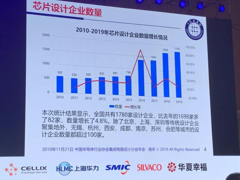 2019年,中国集成电路设计企业数量为1780家,和2018年的1698家相比,增加了82家。北京、上海、惠州的企业数超过100家,无锡、成都、苏州、合肥、西安、南京、杭州、武汉、长沙的设计企业数量过100家。